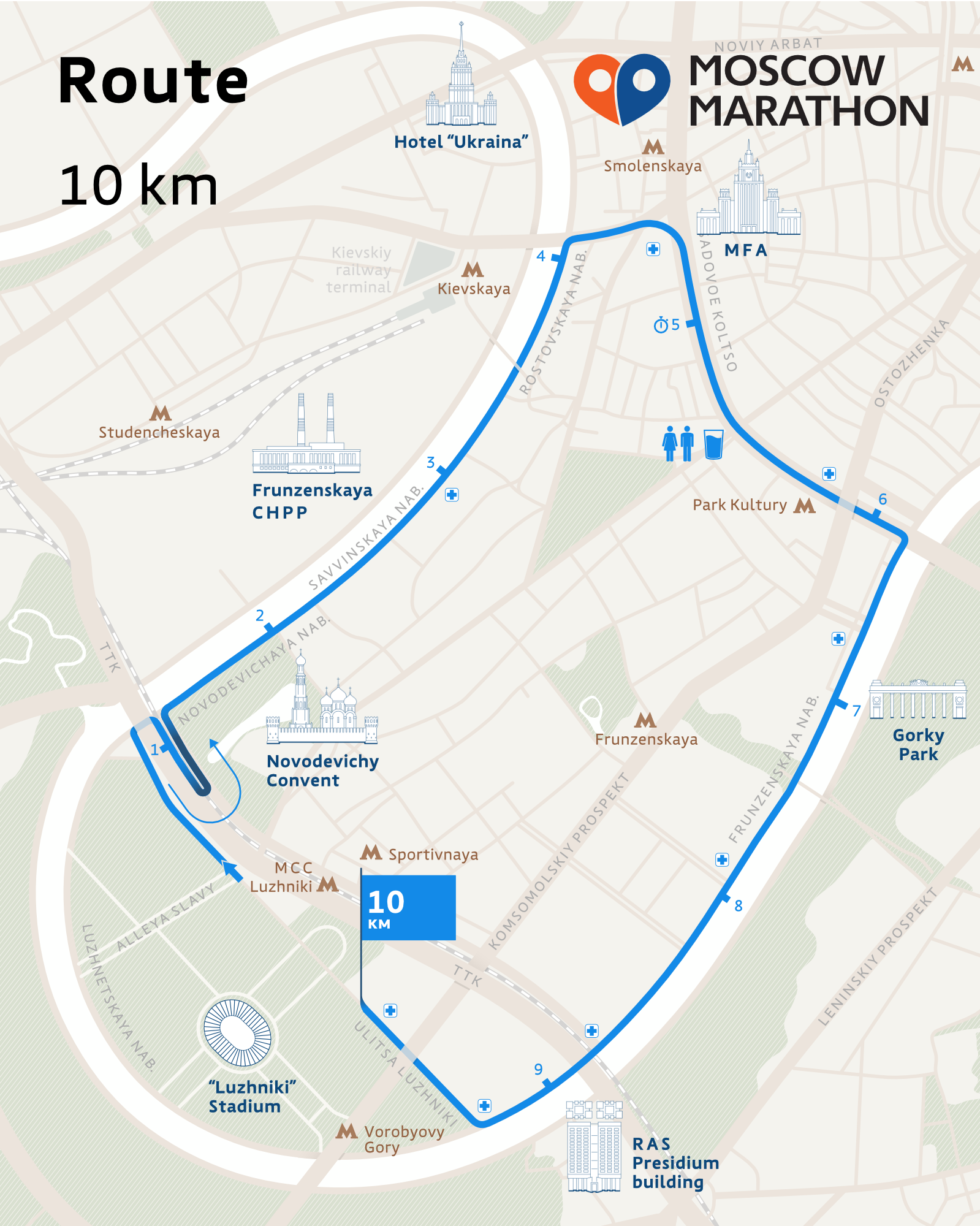 5、莫斯科马拉松路线提供了一个俄罗斯首都的壮观之旅,从莫斯科市的莫斯科河堤岸,到花园环路,穿过克里姆斯基大桥,沿着特维尔大街的莫斯科荫环路,穿过茶道和克里姆林宫的城墙,最后到达卢日尼基奥运会场的终点线。在整个比赛过程中,参赛者将能够看到30多个世界著名的景点,包括克里姆林宫、救世主基督大教堂、大剧院、莫斯科城和七姐妹摩天大楼中的四个。