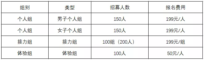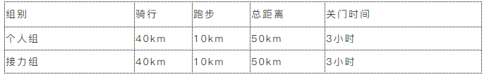 体验组:不限性别,在个人组、接力组比赛结束后,业余骑行、跑步爱好者按骑行、跑步线路连续进行骑跑各一圈。