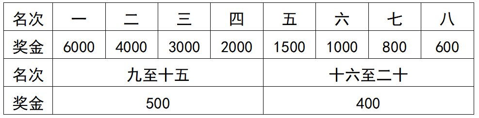 根据净成绩录取前二十名,分别获得如下表所列的奖金(单位:人民币)
