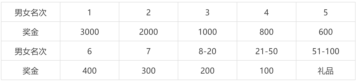 3、团体奖励。参赛队员为10人及以上的团队,可组成3男1女参加团队赛,取团队总净成绩,用时少的团队胜出,奖励团队前20名(奖金如下表,单位:人民币)。