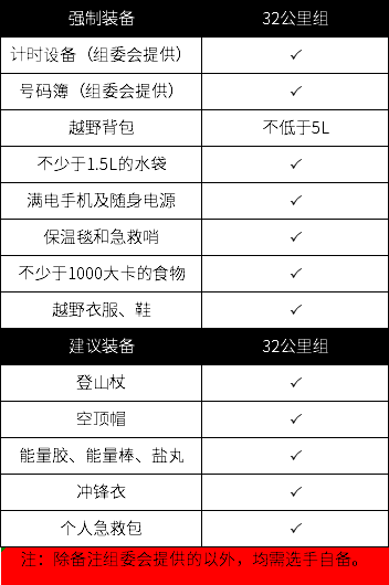 虽是测试赛,但是强制装备一个都不能少,敬畏山野,尊重生命。表中除了标明的“组委会提供”外,一切装备请自己准备,报到时和训练时,我们将会检查。