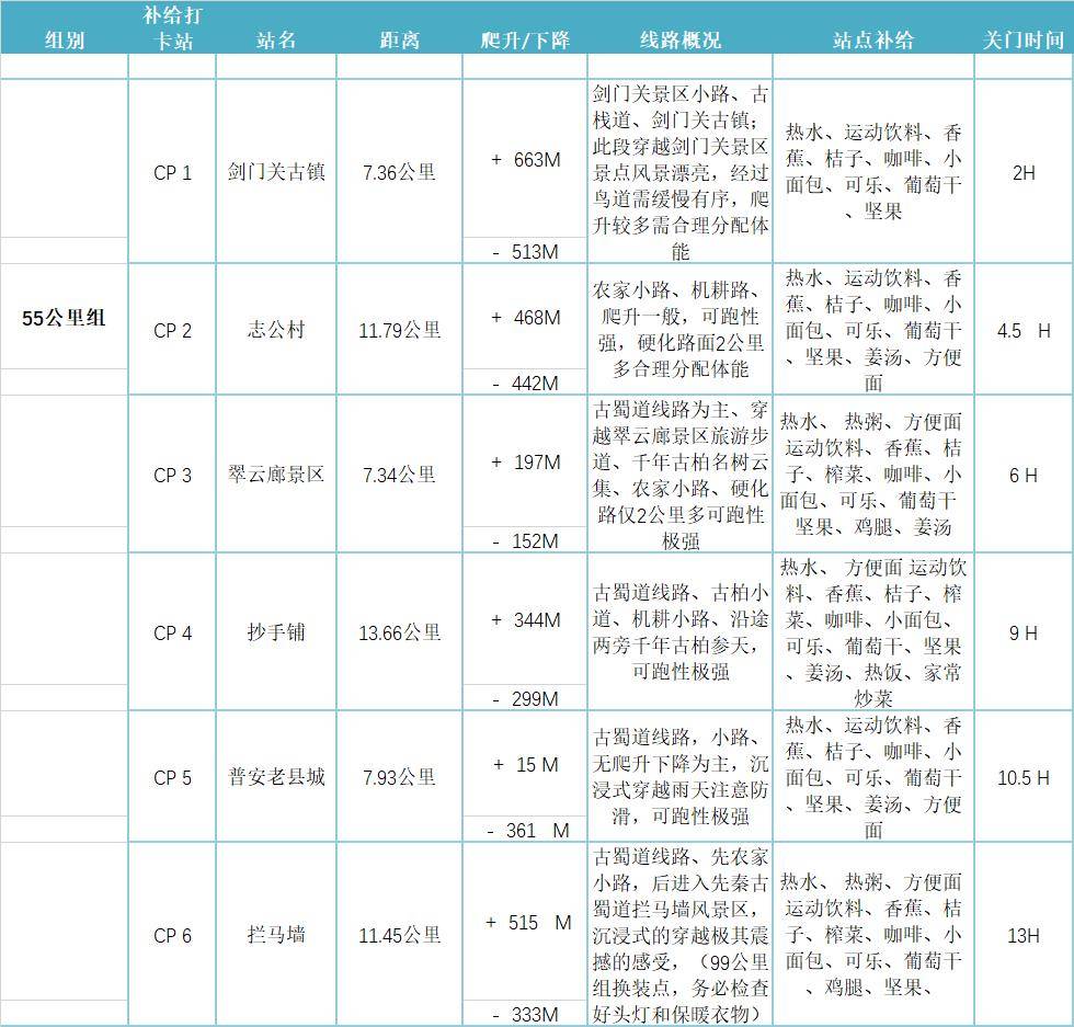 2、赛事当天,55公里组与99 公里组参赛者,应考虑自己预估的完赛时间,建议参考预定距离终点(剑阁县凉山拦马墙)最近16 公里的普安(剑阁县老县城)入住,普安(剑阁县老县城)宾馆酒店条件好设施齐备,普安(剑阁县老县城)去往剑门关高铁站(下寺)、广元市区均有班车;
