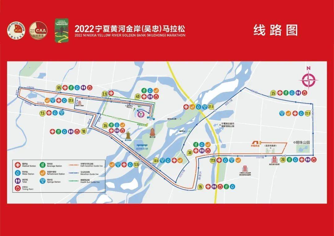 吴忠黄河奥林匹克体育中心东门起跑→黄河路→古峡东街→汉延路→利民西街→利民东街→秀水路→跨越街→吴忠黄河大桥→文华街→开元大道→利华街→朔方路→滨河大道→开元大道→吴忠黄河大桥→跨越街→亲水路→利民东街→嘉宝路→古峡东街→黄河路→吴忠黄河奥林匹克体育中心东门→吴忠黄河奥林匹克体育中心田径场(马拉松终点)
