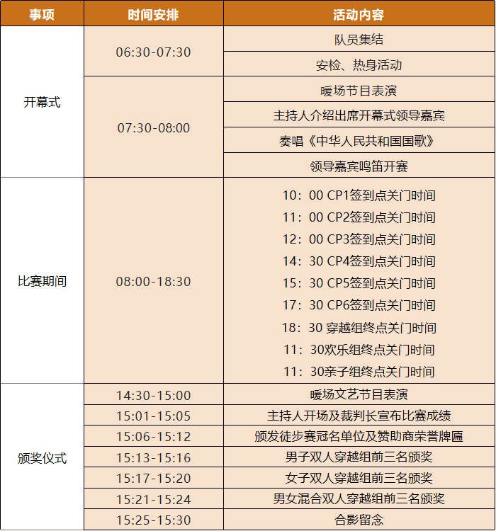 5、穿越组、欢乐组必须双人为一小组参加,亲子组两人或以上为一小组报名参加。穿越组以男子双人、女子双人、男女混合双人组的组合形式比赛,计时以最后到达人员的时间为最终成绩。