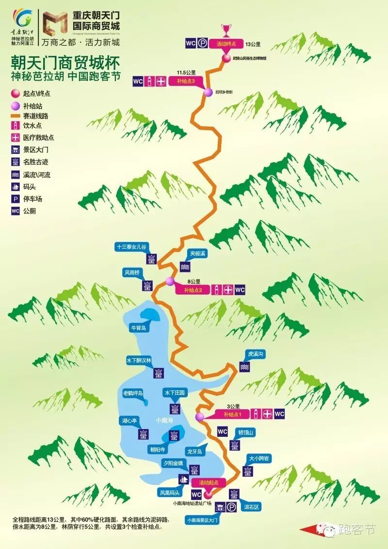 活动路线为环湖非闭合路线,全程位于“中国唯一、世界罕见”的小南海国家地质公园内,起点设在小南海景区海口停车场,终点设在十三寨女儿谷(民俗博物馆终点)。全程路线距离13公里,其中60%硬化路面,其余路线为泥碎路,傍水距离为8公里,林荫穿行5公里,共设置3个检查补给点。