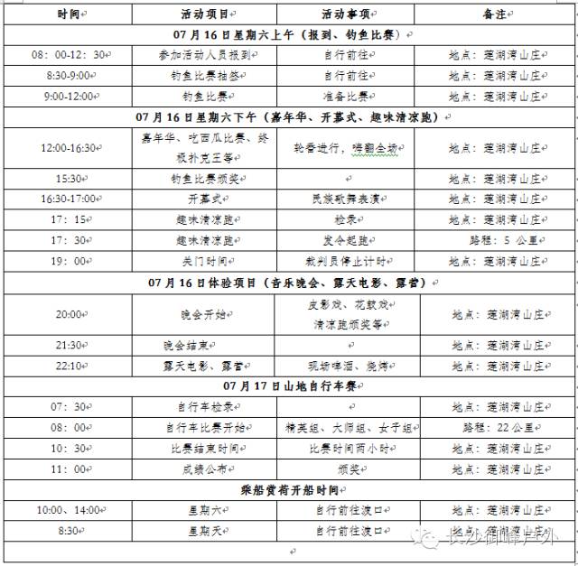 (1)竞技项目:趣味清凉跑、钓鱼比赛、山地自行车赛;(2)体验项目:嘉年华、音乐晚会、露天电影、露营、吃西瓜比赛、终极扑克王。